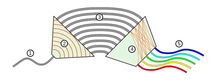 Los AWG constan de una serie de acopladores de entrada (1) y salida (5), una región de propagación en el espacio libre (2) y (4) y las guías de onda de rejilla (3). Las guías de onda de rejilla constan de muchas guías de onda, cada una de las cuales tiene un incremento de longitud constante (ΔL).