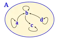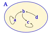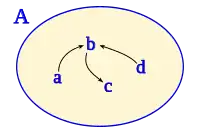 Tomando como conjunto inicial y final a , se asocia un elemento inicial a uno final dentro de un mismo conjunto , determinando una operación matemática, teniendo siempre en cuenta que si bien el conjunto inicial y final son el mismo, la relación es unidireccional. Si el elemento inicial está relacionado con el elemento final, necesariamente no implica que el elemento final esté relacionado con el elemento inicial.