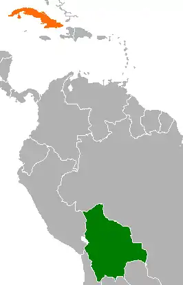 Las relaciones Bolivia-Cuba son las relaciones exteriores entre Bolivia y Cuba. Ambas naciones son miembros de ALBA y Naciones Unidas. Las relaciones se establecieron el 11 de enero de 1983 bajo el presidente boliviano Hernán Siles Zuazo y el mandatario cubano Fidel Castro después de veinte años sin relaciones.[1] En 2013, las relaciones fueron calificadas como "excelentes" por el embajador cubano en La Paz, Bolivia, Rolando Gómez.[2]