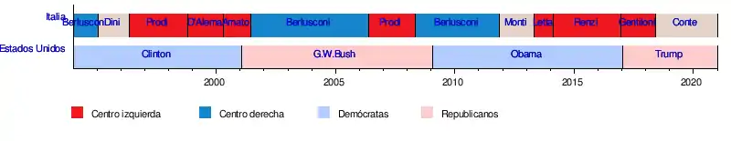 Con el final de los Años de liderazgo (1969-1989), el Partido Comunista italiano aumentó gradualmente sus votos bajo el liderazgo de Enrico Berlinguer. El Partido Socialista (PSI), socio de Demócratas Cristianos y dirigido por el Primer Ministro Bettino Craxi, se volvió más y más crítico de los comunistas y de la Unión Soviética; El mismo Craxi se inclinó a favor del posicionamiento de misiles Pershing II del presidente de los Estados Unidos Ronald Reagan en Italia, un movimiento que los comunistas disputaron. Después de la caída del Muro de Berlín, Italia enfrentó importantes desafíos, ya que los votantes, desencantados con la parálisis política del pasado, la deuda gubernamental masiva y un extenso sistema de corrupción (colectivamente llamado Tangentopoli después de haber sido descubierto por la investigación Manos limpias, exigió reformas políticas, económicas y éticas. Los escándalos involucraron a todos los partidos principales, pero especialmente a los de la coalición de gobierno: entre 1992 y 1994 los Demócratas Cristianos sufrieron una grave crisis y se disolvieron, dividiéndose en varias partes, mientras que también los Socialistas y los otros partidos menores gobernantes también se disolvieron. Los comunistas se reorganizaron como una fuerza socialdemócrata.