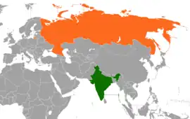 India es el segundo mercado más grande para la industria de defensa rusa. En 2017, aproximadamente el 68% de las importaciones de hardware de los militares indios procedían de Rusia, lo que convirtió a Rusia en el principal proveedor de equipos de defensa.[13] India tiene una embajada en Moscú y dos consulados generales, uno en San Petersburgo y otro en Vladivostok. Rusia tiene una embajada en Nueva Delhi y cuatro consulados generales en Chennai, Hyderabad, Calcuta y Mumbai.