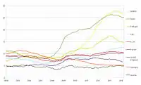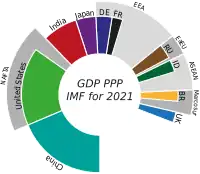 La escala y la velocidad del desarrollo económico en la región de Asia y el Pacífico,[217][218] tanto en términos absolutos como relativos,[219] ha sacudido profundamente la autoconfianza de la población en los países occidentales[220][221][222] y sorprendió a los observadores.[223][224] En 2014, Asia y el Pacífico (+29%) acumuló riqueza más rápido que Europa (+6,6%) y América del Norte (+5,6 %). Sin embargo, América lleva en números absolutos con $ 370.000 (incluidos los activos de vida y pensiones) por hogar y Europa sigue con $ 220.000.[225] Impago de EE. UU. relacionados con la deuda y concesionarios préstamos estudiantiles se encuentran sin resolver y se ha marcado como un riesgo significativo de burbuja.[226][227]