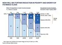 La India considera el cambio de poder global en curso,[38] desde el Atlántico hasta el Océano Índico, como una oportunidad para sacar a millones de personas de la pobreza extrema y una marcha a la Modernidad.[39] Indios, observando el ascenso geopolítico de China,[40] han concluido que su país solo puede ser tomado en serio en los asuntos mundiales del siglo XXI si se puede hablar desde una posición de fuerza económica. Los inversores y las empresas se han animado a aprovechar las aspiraciones de los 1.2 billones de personas.[41] El mercado indio de bienes y servicios, y los beneficios derivados del comercio del Océano Índico, a través de la Marca en la India, iniciativa lanzada por el Gobierno de la India.[42][43] El desafío que enfrenta la India es aprovechar con éxito la división de la juventud del país[41][44][45][46][47][48] hacia la consecución de un propuesto "siglo de la India."[49][50][51] y evitar la arrogancia que el crecimiento económico de la India es inevitable.[52][53][54][55]
