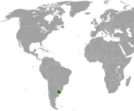 Durante ambas guerras mundiales, Suiza actuó como intermediario entre Uruguay y Alemania. Cerca del final de la Primera Guerra Mundial, en 1918 y tras un incidente en el que un submarino alemán capturó una delegación enviada por Uruguay a Francia, "Uruguay provocó que Alemania se preguntara por Suiza, si Alemania entendía que existía un estado de guerra entre los dos países . "[10] De nuevo, durante la Segunda Guerra Mundial, Suiza, representó a Uruguay en Alemania, Italia, Hungría y Francia.[11]