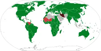 - (Irán,[36] Irak,[37] Kuwait,[28] Líbano,[28] Arabia Saudita,[28] Siria,[28][38] y Yemen[28] no reconocen a Israel.)