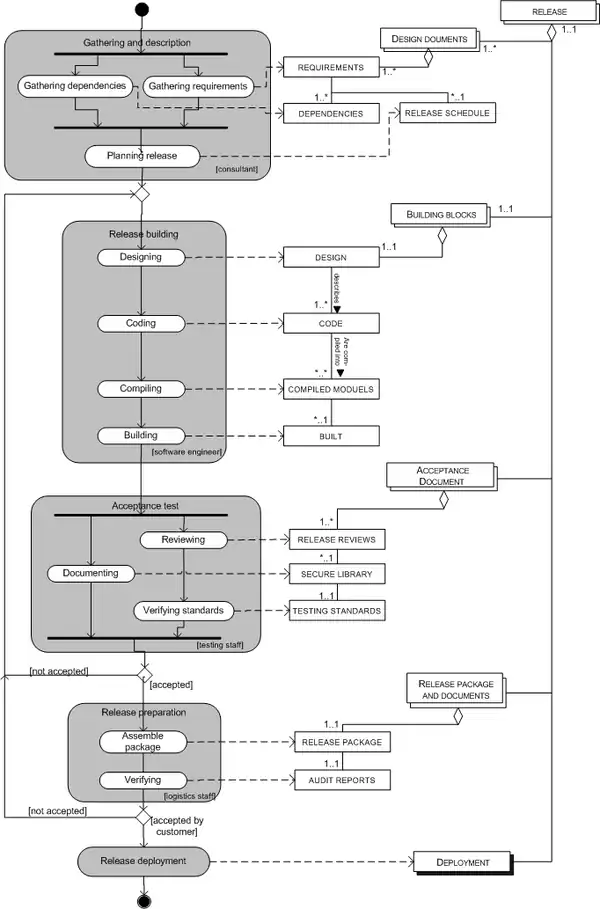 Cuando se prepara una entrega, primero debemos informarnos de lo que se exige que cumpla la nueva entrega, estos son los requerimientos. Por ejemplo, las mejoras que deben superar las fallas en el software existente. Eso se puede organizar mediante el uso de un Sistema de seguimiento de errores (Bugtracker). Un paso paralelo es fijarse en las dependencias. El software esta a menudo compuesto de muchos módulos que dependen uno del otro para trabajar. Si cambia uno, eso afectára al otro. Una vez que los requerimientos y las dependencias nos son conocidas se puede comenzar a planificar el proceso de entrega. La planificación consiste en fijar los pasos necesarios, los plazos límites, etc. En la figura 1 se puede visualizar el proceso usando meta modeling technique.