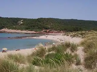 - Menorca es la segunda isla más grande del archipiélago con sus 694,39 km² de superficie, y es la que está situada más al noreste. Tiene una forma alargada, con una costa notablemente articulada. En la isla hay presencia de pequeños cerros que exceden los 200 metros y, por lo general, el relieve es muy llano. La altitud máxima es el cerro de El Toro con sus 355 metros. La costa de Menorca se intercala con pequeños acantilados, las extensas playas y las calas.