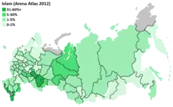 El Islam, mayoritariamente suní, es la segunda religión de Rusia.[14][15] Es liderado por el Concejo de los Muftíes de Rusia. El número exacto de musulmanes rusos es desconocido, pues algunas fuentes oscilan de entre 7 y 14 millones. La mayoría de los musulmanes son étnicamente túrquicos, tanto nacidos en Rusia como inmigrantes provenientes de ex repúblicas soviéticas como Kazajistán y Uzbekistán.