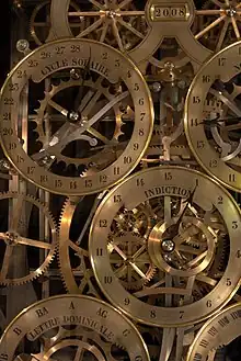 El reloj de Schwilgué hace lo mismo que el de Dasypodius pero de mejor manera. Mientras que el viejo reloj indicaba las fiestas movibles por adelantado para un periodo de cien años, el nuevo reloj determina las fiestas movibles del año siguiente y a fines de cada año. Podemos considerar este mecanismo - el cómputo eclesiástico - como un calendario perpetuo. La fecha de Pascua, es sencilla de definir y se adoptó en el Concilio de Nicea del año 325. Según el concilio, la Pascua cae "en el domingo siguiente al día catorce lunar, esto es, en el 21 de marzo o inmediatamente después".[3] Todo se complicó con la introducción del calendario gregoriano en 1582, que cambió las fechas la luna llena pascual y las reglas de cálculo. Por lo que sabemos, Schwilgué fue el primero que calculó mecánicamente las fechas de Pascua (1821) sobre un prototipo concluido en 1816, que desapareció tras la Segunda Guerra Mundial. Este mecanismo aparece, algo más grande, en la parte inferior izquierda del reloj actual.