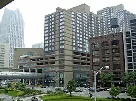 Sus primeros cinco pisos están conectados con el adyacente Courtyard by Marriott, de diseño similar. La estructura que los conecta cubre la calle Larned entre las calles Randolph y Brush constituye el parqueadero de cinco pisos.