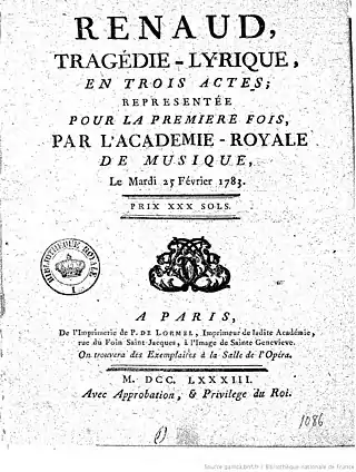 Renaud es una tragédie lyrique en tres actos con música de Antonio Sacchini y libreto en francés de Jean-Joseph Lebœuf,[1] basada en los Cantos XVII y XX del poema épico de Torquato Tasso Gerusalemme liberata y, más directamente, en la tragedia en cinco actos de Simon-Joseph Pellegrin, Renaud, ou La suite d'Armide, que había sido musicada por Henri Desmarets en 1722 y se pretendía que fuera una secuela a la famosa ópera de Lully Armide. Según Théodore de Lajarte, Lebœuf recibió ayuda de Nicolas-Étienne Framery, el traductor habitual de los libretos de Sacchini.[2] Se estrenó en la Académie Royale de Musique, París el 23 de febrero de 1783.