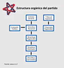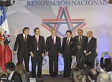 Renovación Nacional (RN) es un partido político chileno conservador liberal fundado el 29 de abril de 1987,[26] producto de la fusión de tres grupos de derecha organizados en la década de 1980: el Movimiento de Unión Nacional (MUN), la Unión Demócrata Independiente (UDI) y el Frente Nacional del Trabajo (FNT). A ellos se unieron, además, antiguos militantes del Partido Nacional (PN). En 1988 y tras disputas internas estratégicas y de liderazgos, los miembros de la UDI renunciaron al partido y decidieron formar una colectividad propia.[26]