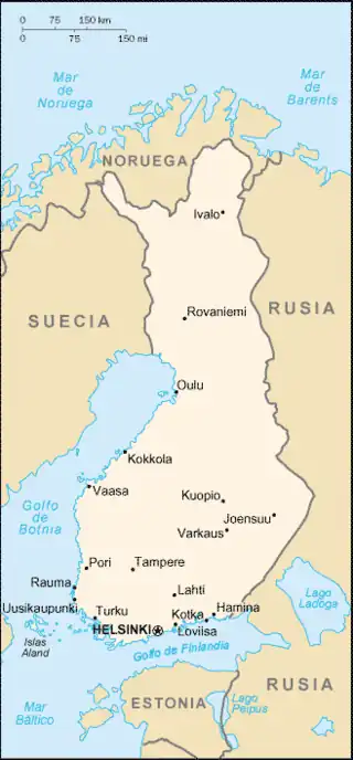 Finlandia, oficialmente la República de Finlandia (en finés: ⓘ/Suomen tasavalta; en sueco: Finland/Republiken Finland), es uno de los veintisiete Estados soberanos que forman la Unión Europea. Está situado en el noreste de Europa. Tiene fronteras al oeste con Suecia, al este con Rusia y al norte con Noruega. Por el oeste y el sur está rodeada por el mar Báltico, que la separa de Suecia y Estonia, cruzando los golfos de Botnia y Finlandia, respectivamente. La capital y ciudad más importante del país es Helsinki, y la segunda ciudad más grande y área urbana más grande es Tampere, 180 kilómetros al norte de Helsinki.