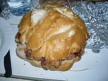 Repelá partida horizontalmente en dos mitades, con chorizo, costillas y lomo entre ambas mitades