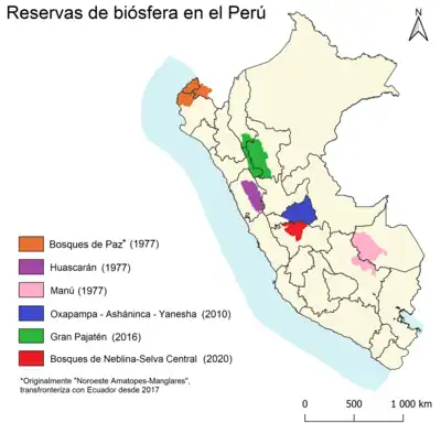 En 1977, el Perú logra que la Unesco reconozca 3 áreas como reserva de biósfera que son Huascarán, Manú y Noroeste; posteriormente en el 2010 se proclama reserva de biósfera al área protegida Oxapampa-Ashaninka-Yanesha; en el 2016, Gran Pajatén; en 2020 el Bosques de Neblina-Selva Central; en el 2021 a la biosfera Avireri-Vraem y en el 2023 la biosfera Bicentenario-Ayacucho.[2]