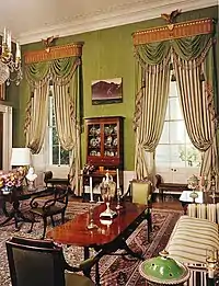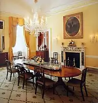Cuando se creó, el comedor fue decorado con paredes pintadas y mobiliario estilo Luis XVI que pertenecía a los Kennedy. Henry Du Pont recomendó que la sala de estar se amueblase con antigüedades de estilo americano Federal. A partir de Kennedy, se ha ido adquiriendo una colección de antigüedades que adornan la estancia; así, un cuadro que se hizo en Massachusetts entre 1810 y 1815, un conjunto de sillas, c. 1890, y un panel de madera tallada, manufactura de Filadelfia, c. 1815. La sala se utiliza para pequeñas cenas y almuerzos, y debido al reducido tamaño de estos acontecimientos hay un servicio de porcelana muy sencillo.