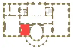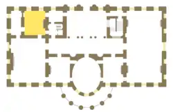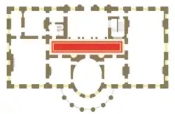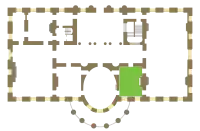 La habitación tiene armarios en la pared norte redondeado a cada lado de la puerta de la sala oeste, Sentado, instalados como parte de la reconstrucción de Truman (y se duplican en el comedor privado). Las puertas del armario se disfrazan y empapeladas y paneles como el resto de la pared. Otra puerta disimulada en la pared este conduce a la sala de estar.