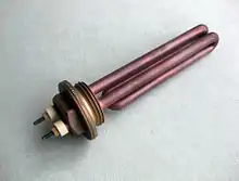 - Los elementos tubulares (revestidos) normalmente comprenden una bobina fina de hilo calefactor de aleación con resistencia al nicromo (NiCr), que se encuentra en un tubo metálico (de aleaciones de cobre o acero inoxidable como Incoloy ) y aislado por polvos de óxido de magnesio . Para mantener la humedad fuera del aislante higroscópico, los extremos están equipados con perlas de material aislante tales como cerámica o caucho de silicona, o una combinación de ambos. El tubo pasa a través de una matriz para comprimir los polvos y maximizar la transmisión de calor. Estos pueden ser una varilla recta (como en los hornos tostadores ) o doblados a una forma para abarcar un área a calentar (como en las estufas eléctricas, los hornos y las cafeteras ).