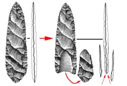 - Acanaladura de la base de algunas puntas de proyectil, o su adelgazamiento basal para facilitar su enmangue, son dos ejemplos de técnicas especiales con desechos característicos específicos de la Edad de Piedra en América (por ejemplo, Folsom o, en el caso de la ilustración: Clovis).