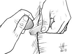 - Técnica del golpe de tranchet:[6] es una técnica observada a menudo en útiles bifaciales como hachas o bifaces. Se consigue dando un golpe cerca de uno de los bordes, lo que genera un negativo de lascado con un ángulo muy agudo respecto a la superficie golpeada, proporcionando un filo muy cortante a lo largo de la arista. En algunos casos, esta técnica busca el reavivado de un borde dañado. Aparentemente es una especie de variante del golpe de buril.