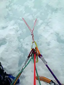 Si el anclaje se ensambla correctamente, la carga se puede distribuir entre los puntos de aseguramiento individuales,[1] en lugar de colocar la carga completa en un solo punto. Esto disminuye las posibilidades de que uno de los puntos ceda, y si alguno de los puntos cede, el segundo punto siempre debe ser capaz de soportar la carga.