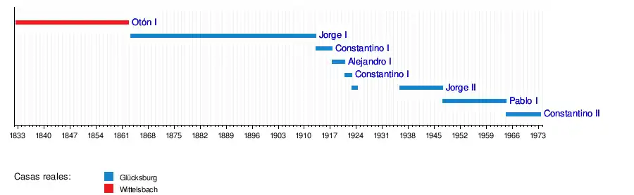 El Reino de Grecia estuvo gobernado por la Casa de Wittelsbach entre 1832 y 1862 y por la Casa de Glücksburg de 1862 a 1973 (con el inciso de la Segunda República Helénica entre 1924 y 1935). En 1974 fue reemplazado definitivamente por la República Helena que perdura hasta la actualidad. Entre 1967 y 1973 nominalmente seguía siendo un reino, aunque bajo la Dictadura de los Coroneles.