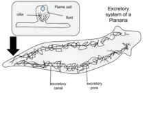Los órganos secretores de los rabditoforos, los protonefridios, también tienen una anatomía única en la que las células flamígeras y las células tubulares presentan una serie de proyecciones citoplásmicas que se superponen, formando un "vertedero" de dos células.