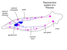 El aparato reproductor es hermafrodita, son monoecios (hermafroditas simultáneos), y es la estructura más compleja de su anatomía. Los testículos son muy numerosos, se distribuyen por todo el cuerpo y se reúnen en un conducto deferente que conduce al pene. Los ovarios pueden ser también numerosos y se unen en el oviducto que desemboca en el atrio genital; algunos grupos poseen glándulas productoras de células vitelinas, que son rodeadas junto con los huevos por secreciones de las células de la pared del atrio, formando un capullo. Pueden presentar reproducción sexual, reproducción asexual o alternante estacional (sexual en invierno y primavera, y asexual en los meses de verano y otoño).