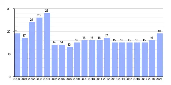 | Gráfica de evolución demográfica de Riomaior entre 2000 y 2021 |