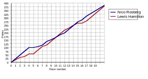 La batalla por el título entre los dos pilotos se decidió en Abu Dabi, donde los equipos y sus pilotos obtuvieron el doble de puntos ganados por las posiciones al final de la carrera. Hamilton tuvo un comienzo perfecto, pasando a Rosberg antes de la curva 1 para tomar la delantera antes de ganar para asegurar su segundo Campeonato del Mundo. Rosberg finalmente terminó en el puesto 14, debido a los problemas de potencia en su Mercedes F1 W05 Hybrid. A pesar de los consejos de radio para retirar el monoplaza, Rosberg dijo que le gustaría ir al final y terminar la carrera, lo que finalmente hizo. Antes de la ceremonia del podio, el alemán fue a felicitar a Hamilton por ganar el título. Más tarde, el británico le rindió tributo a Rosberg por su amabilidad en la derrota. Lewis terminó la temporada con 384 puntos, registrando 11 victorias y 7 pole position por delante de Rosberg, quien terminó con 317 puntos, registrando 5 victorias y 11 pole position.[4]