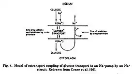 - Ernest M. Wright and Eric Turk. "The sodium glucose cotransport family SLC5". Archivado el 28 de marzo de 2020 en Wayback Machine. Pflügers Arch 447, 2004, p. 510. "Crane in 1961 was the first to formulate the cotransport concept to explain active transport. Specifically, he proposed that the accumulation of glucose in the intestinal epithelium across the brush border membrane was coupled to downhill Na+ transport cross the brush border. This hypothesis was rapidly tested, refined and extended [to] encompass the active transport of a diverse range of molecules and ions into virtually every cell type.”