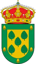 «Un campo de oro con 5 piñas de sinople puestas en aspa; la bordura de sinople cargada de 5 bellotas de oro. Al timbre Corona Real Cerrada»