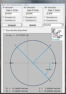 Cuando la roseta está instalada en una superficie de prueba sometida a un estado de deformación arbitraria, las variables y son desconocidas, Pero las deformaciones , y se puede medir. De este modo, , y , las deformaciones principales y el ángulo pueden ser expresados en términos de las tres medidas de deformación así: