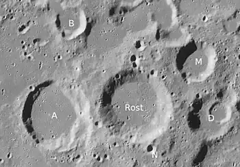 ![]() Entorno de Rost (a la derecha de la imagen). En el centro, la gran Cuenca Schiller-Zucchius, cuyo anillo exterior pasa entre Rost y Rost A. |