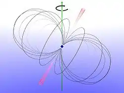 Los pulsares son estrellas de neutrones que rotan a gran velocidad y que poseen un campo magnético intenso. Desde sus polos magnéticos emiten un estrecho haz de radiación electromagnética; si el barrido del haz está orientado en dirección al sistema solar, el pulsar produce un pulso periódico que puede ser detectado desde la Tierra. La energía irradiada por el campo magnético gradualmente ralentiza la velocidad de rotación, de modo que en los pulsares más antiguos transcurren varios segundos entre cada pulso.[27]