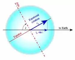 La componente de la velocidad radial observada por el ensanchamiento de línea, depende de la inclinación del eje de la estrella respecto a la línea de visión. Dicho valor viene dado por , donde ve es la velocidad de rotación en el ecuador, e i es la inclinación. Sin embargo, i no siempre es conocida, por lo que en muchos casos sólo se conoce el valor mínimo para la velocidad de rotación de la estrella. Es decir, si i no es un ángulo recto, entonces la velocidad real es mayor que .[2] Este valor es conocido como velocidad de rotación proyectada.