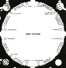 Hay un grupo de 11 estatuas que rodea la rotonda, entre ellas: George Washington, bronce. Andrew Jackson, bronce. James Garfield, mármol. Dwight D. Eisenhower, bronce. Ronald Reagan, bronce. Martin Luther King. Bronce. Grupo de mujeres sufragistas. Mármol. Thomas Jefferson. Bronce. Ulisses S. Grant. Mármol.