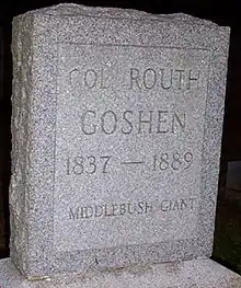 Fue originalmente enterrado sin lápida por temor a que su cuerpo fuera desenterrado y su esqueleto puesto en exhibición. El cementerio es el Cedar Grove Cemetery en Middlebush, Nueva Jersey. En su lápida colocada posteriormente se lee "Col. Routh Goshen, Middlebush Gigant, 1837-1889".[20]