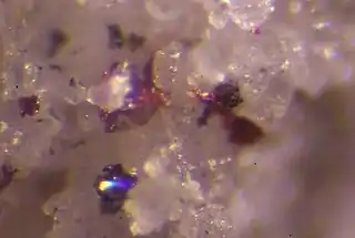 | Hábito cristalino | En granos anhédricos sin caras, rellando vetas | |