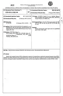 Con la información de las secuencias EST se hizo una primera solicitud de patente por los Estados Unidos de América, representados por el Secretario de Salud y Servicios Humanos de los EE. UU., con Venter, Adams y Moreno como inventores. Sin embargo, las diferencias con el gobierno americano sobre la política de patentes[15][16][17] respecto a todos los genes identificados por el equipo de Venter, propició que éste abandonara en bloque los NIH para fundar el Instituto de Investigación Genómica (TIGR),[18] en Rockville, Maryland, donde continuó su labor.