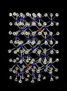 Estructura cristalina del rubí que muestra la sustitución de iones Al3+ (azul) por Cr3+ (rojo). La densidad de sustitución de iones Cr3+ en este modelo es de aproximadamente el 2%, aproximándose al dopaje máximo que se encuentra normalmente.[3].