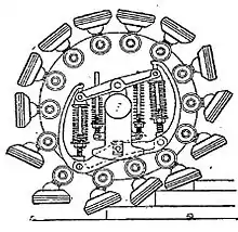 Un dispositivo destinado a reemplazar la rueda de un vehículo autopropulsado para su uso en carreteras en mal estado y para aproximarse a la suavidad del funcionamiento de una rueda sobre un carril. La banda de rodadura consiste en una serie de pies de goma calzados que están conectados por juntas de rótula a los extremos de los radios deslizantes. Cada radio tiene unido un pequeño rodillo que a su vez corre bajo un corto riel giratorio controlado por un poderoso conjunto de resortes. Esta disposición permite que los pies se acomoden a obstáculos incluso como escalones o escaleras.Webster's Revised Unabridged Dictionary, C&G Merriam, 1913..[2]