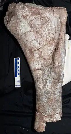 ![]() El húmero holotipo en vista anterior con una escala de medida. | ||