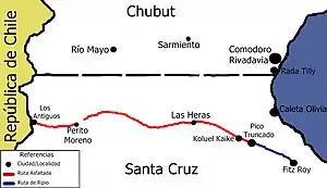 - Departamento Deseado: Fitz Roy (km 0-1), Pico Truncado (km 57-63), Koluel Kaike (km 83-84) y Las Heras (km 139-145)