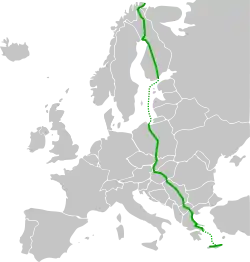 Vardø – Vadsø – Nesseby – Varangerbotn – Tana – Utsjoki – Inari – Ivalo – Sodankylä – Rovaniemi – Kemi – Oulu – Jyväskylä – Heinola – Lahti – Helsinki … Gdynia - Gdańsk – Toruń – Włocławek - Łódź – Piotrków Trybunalski – Częstochowa – Katowice – Bielsko-Biała – Žilina – Bratislava – Győr – Budapest – Szeged – Subotica – Novi Sad – Belgrade – Niš – Leskovac – Vranje – Kumanovo – Skopie – Veles – Gevgelija – Tesalónica – Larisa – Lamia – Atenas … La Canea – Iraklion – Agios Nikolaos – Sitía