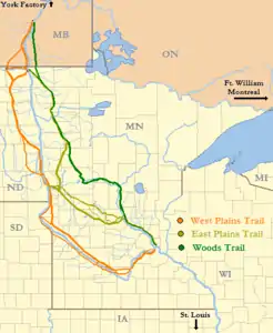9. Morse, Fur Trade Routes of Canada (1969), p. 48; Véase también HBC Heritage, The North West Company. Hess, Minnesota Red River Trails (1989), p. E–5; Kelsey, Red River Runs North! (1951), p. 146. Berton, The Impossible Railway (1972), pp. 35–38; Morrison, Dawson Road.