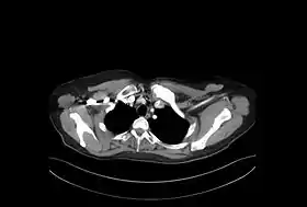 - Se han descrito varios patrones de artritis axial y periférica, semejantes fundamentalmente a las espondiloartropatías seronegativas. Sin embargo, no se ha demostrado una asociación especial con el HLA B27. En cuanto a la afectación del esqueleto axial, la pared torácica anterior es la zona más frecuentemente afectada, en particular en los pacientes con pustulosis palmoplantar. Los pacientes pueden presentar dolor espontáneo, dolor a la presión o tumefacción en la zona del esternón y sus articulaciones.[8] Igualmente pueden verse afectados los cuerpos vertebrales y las articulaciones sacroilíacas, refiriendo los pacientes dolor lumbar de tipo inflamatorio. La artritis periférica, en general asimétrica y de grandes articulaciones, se puede observar entre un 10-30% de los casos.[11][13] También puede encontrase afectación de huesos largos y huesos planos.[11][13]