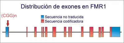Distribución de exones en el gen FMR-1 y posición de las repeticiones del trinucleótido CGG (señalada por flecha). Cuando se supera el valor umbral, se produce el SXF.