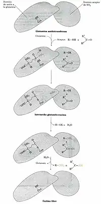 ATP + ácido glutámico <--> ADP + γ-glutamil-fosfato γ-glutamil-fosfato + NH3 <--> Glutamina + Pi