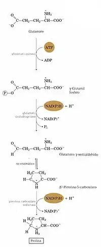 La prolina es otro aminoácido no esencial que puede ser sintetizado a partir de α-cetoglutarato, por medio de las reacciones que aparecen en la figura: